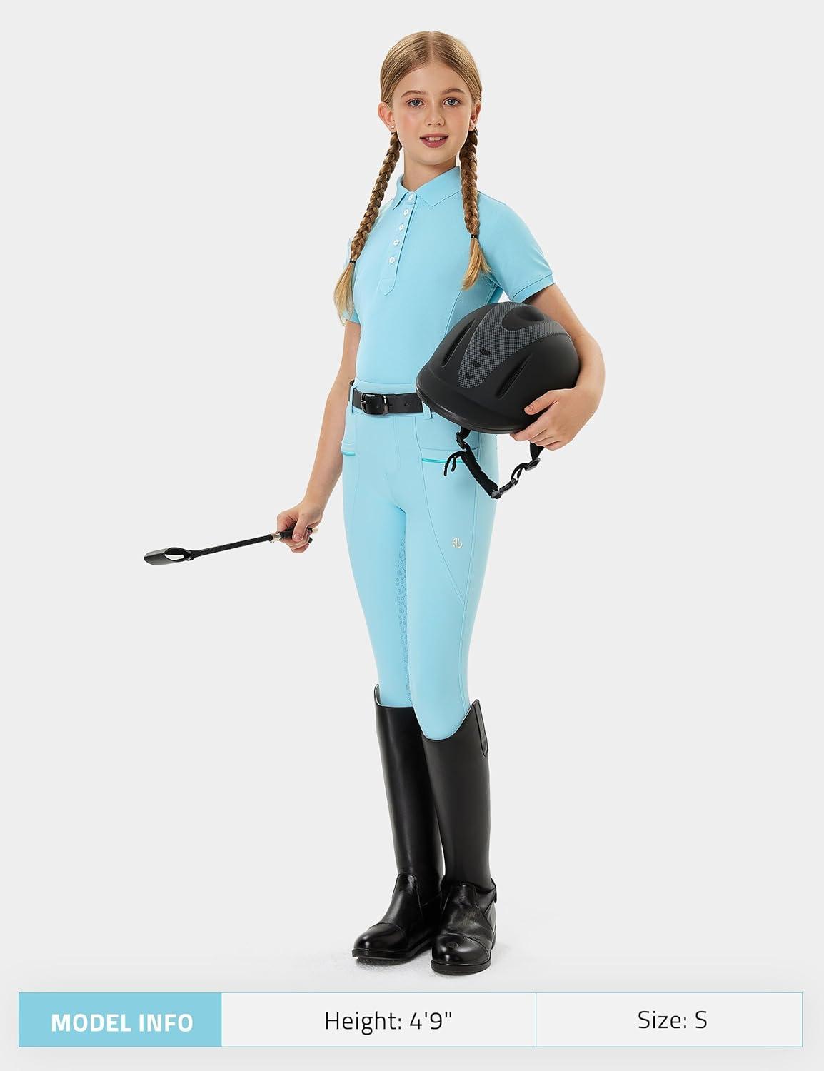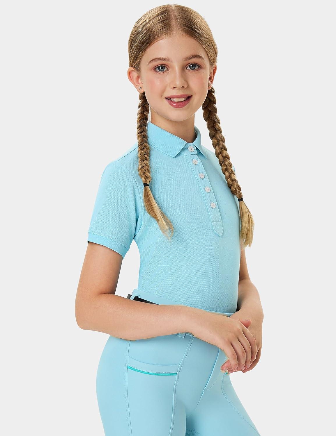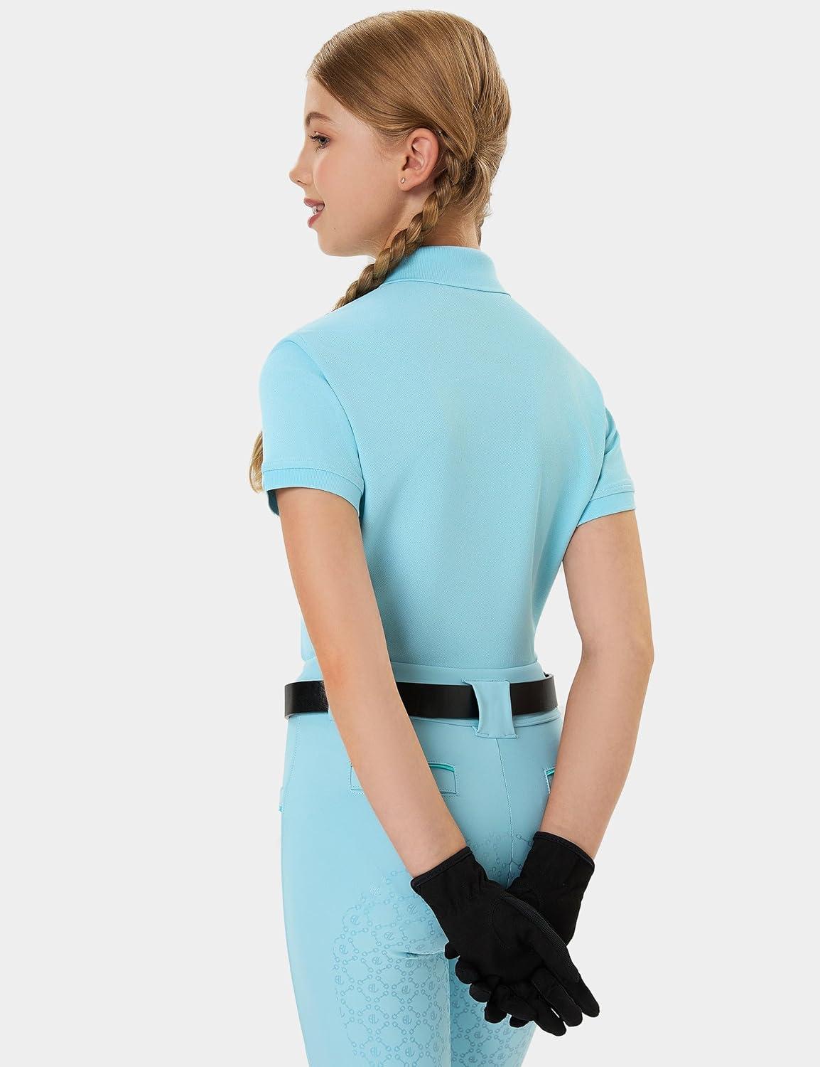FitsT4 Sports Girls Equestrian Shirt Short Sleeve Horse Riding Polo Shirts Button UP Horseback Show Shirt(Lightblue)