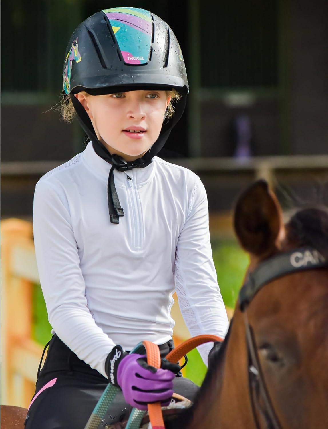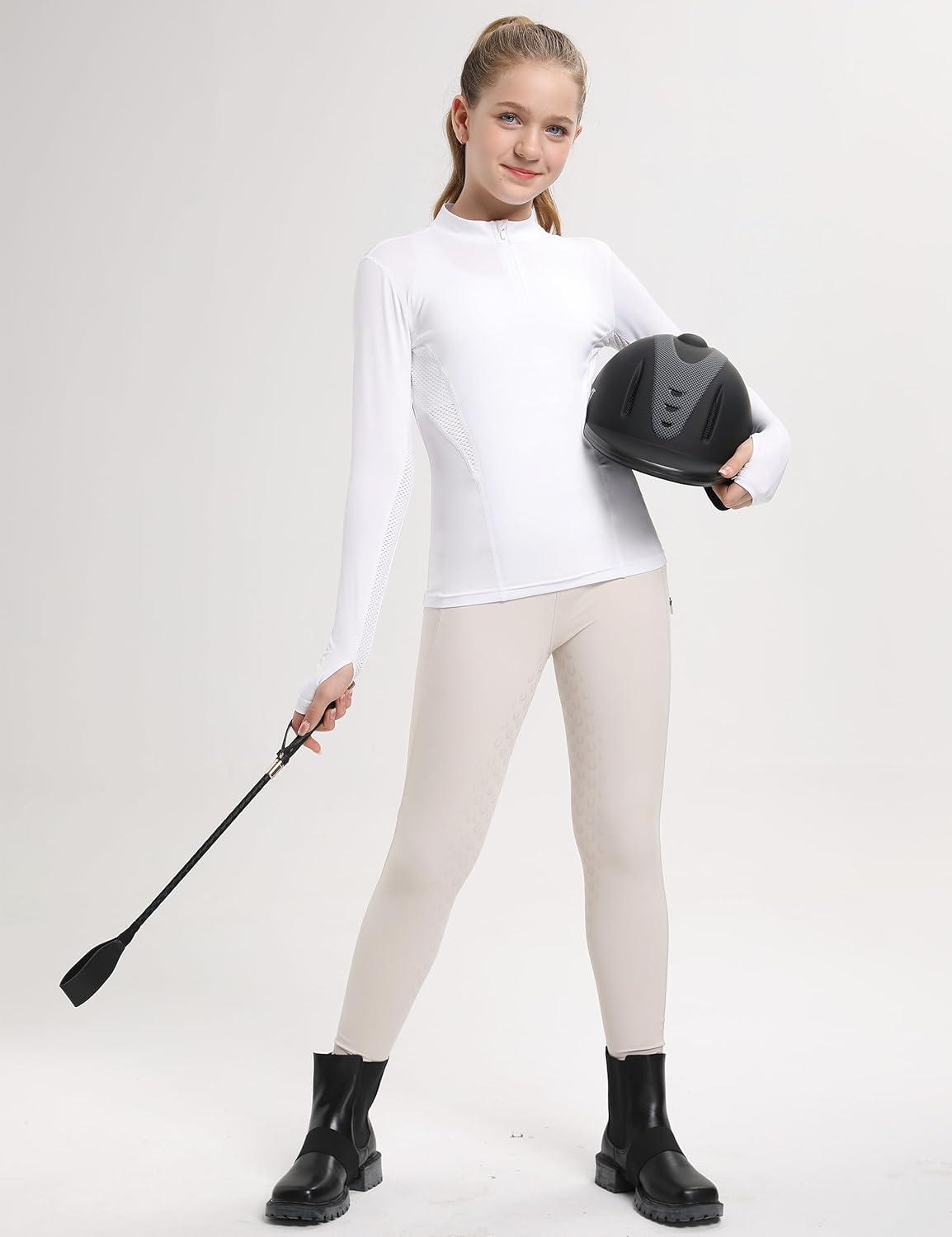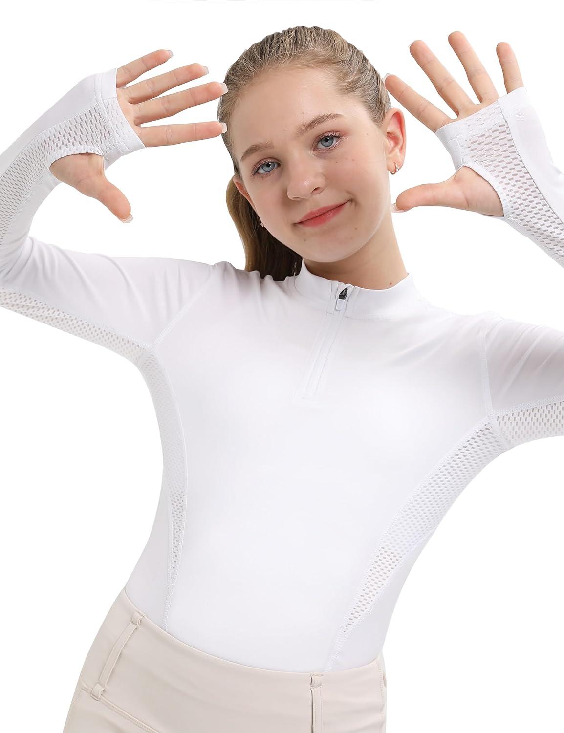 FitsT4 Sports Girls Long Sleeves Shirts Thumbhole English Horse Riding Shirt UPF50 Quick Dry Kids Equestrain Half Zip Jacket(White)