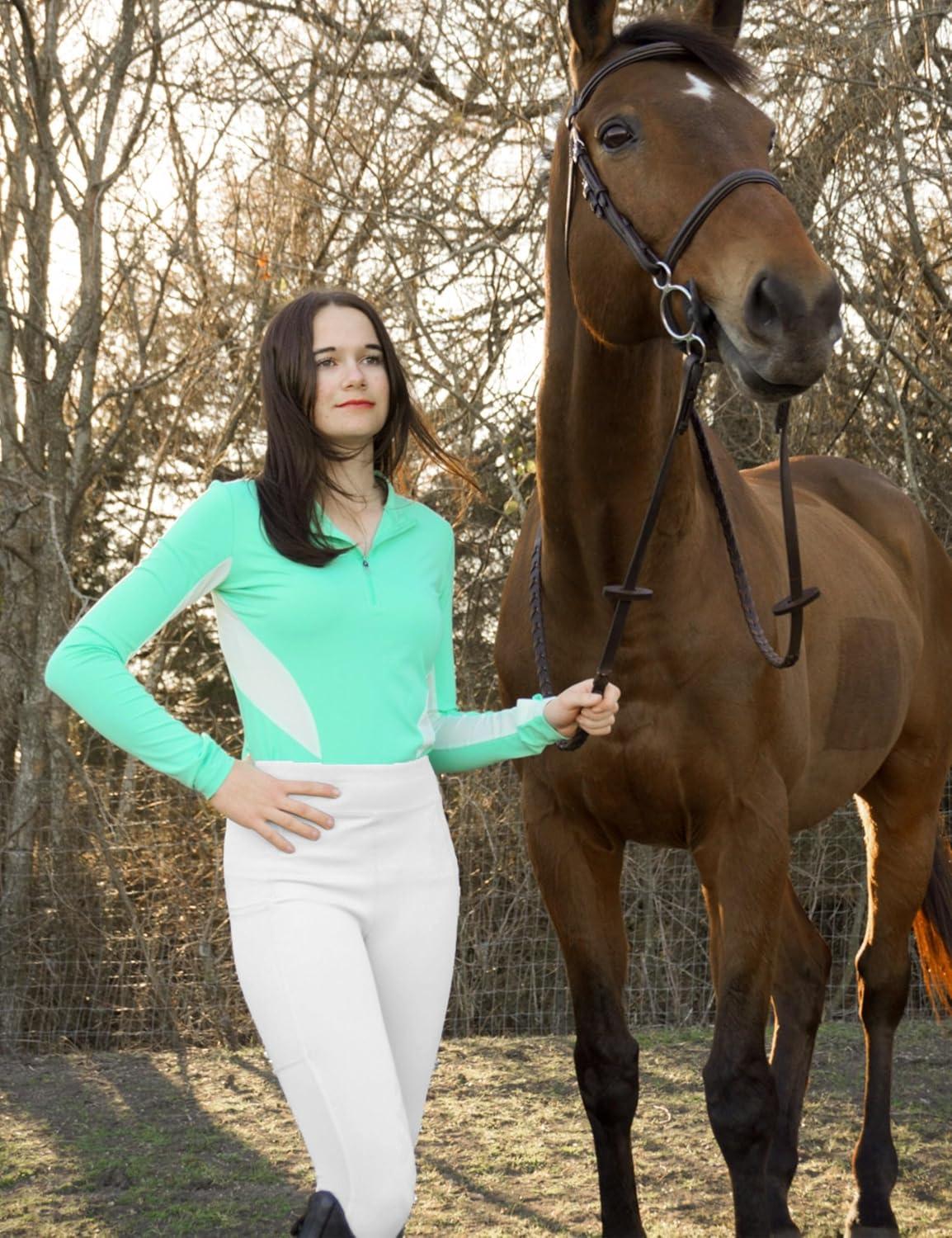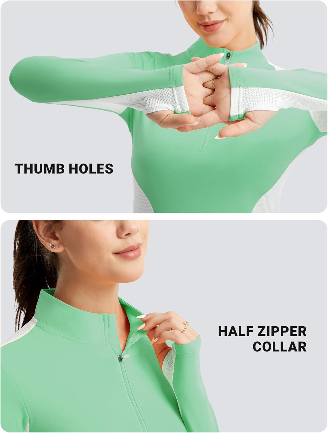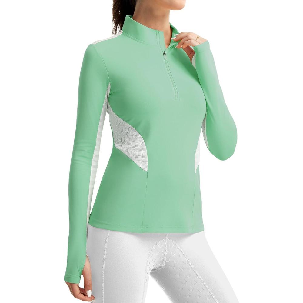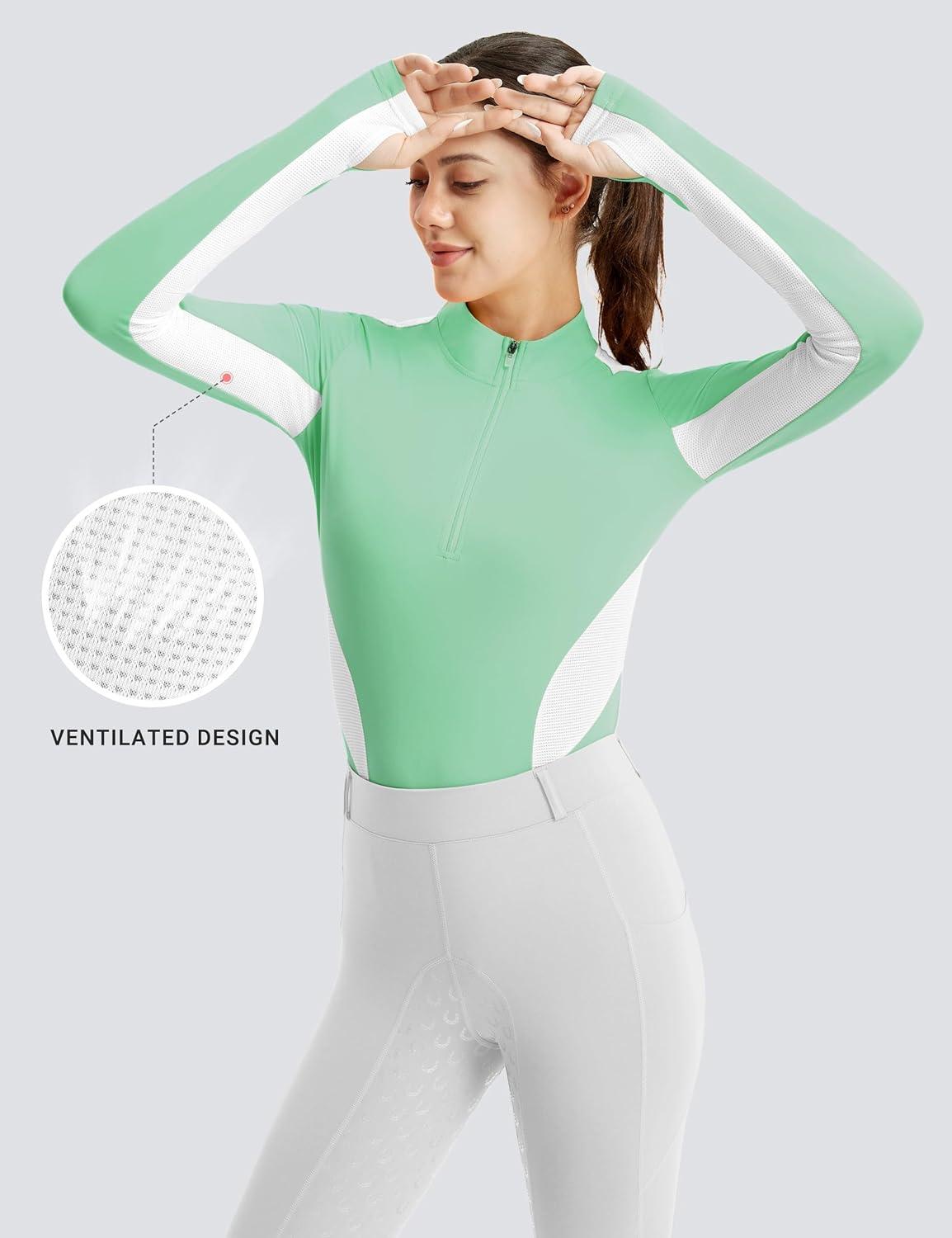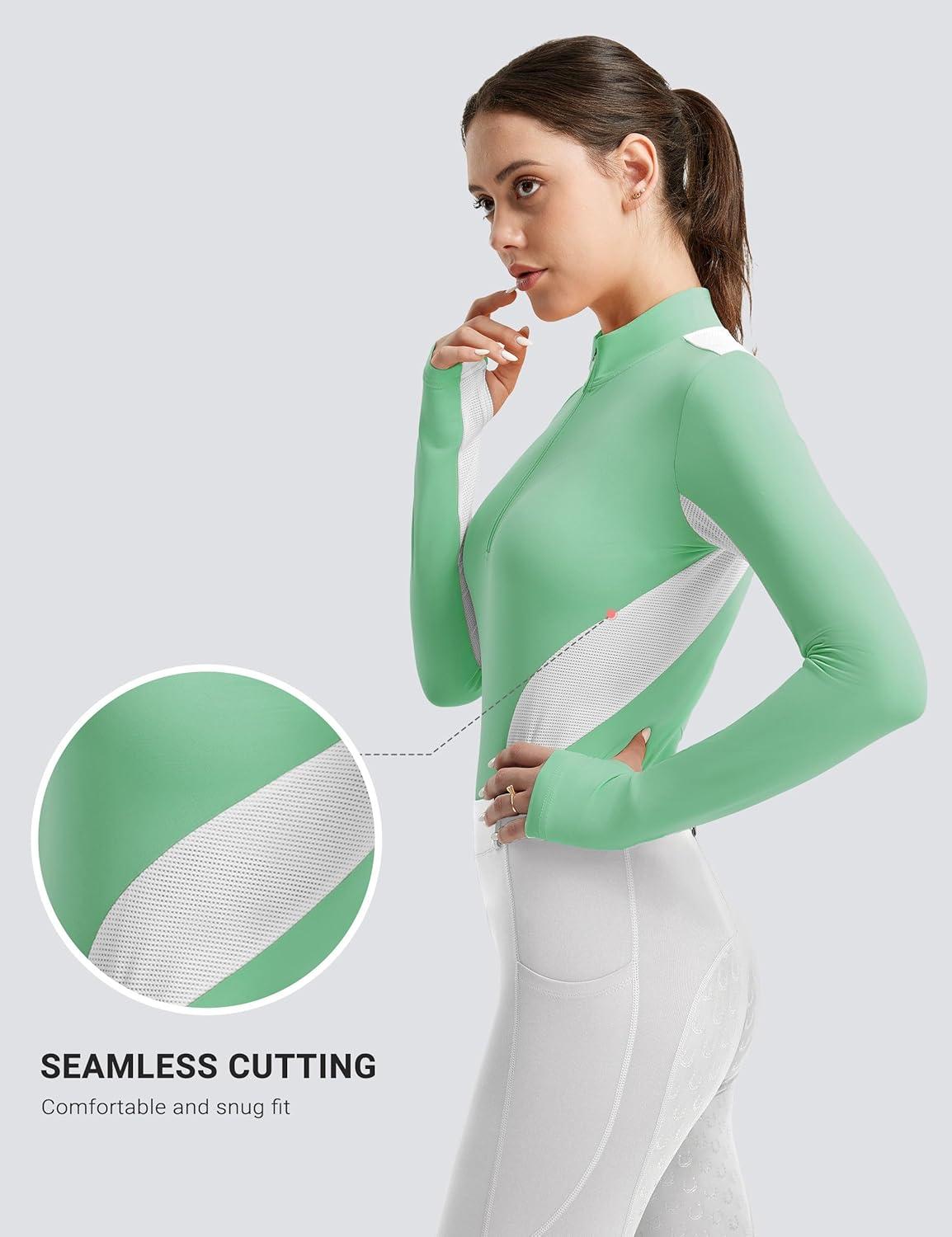 FitsT4 Sports Womens Equestrian Shirts Thumbholes Long Sleeve Horse Riding Shirts Quick Dry UPF50+ Riding Top Half Zip(Cabbage)