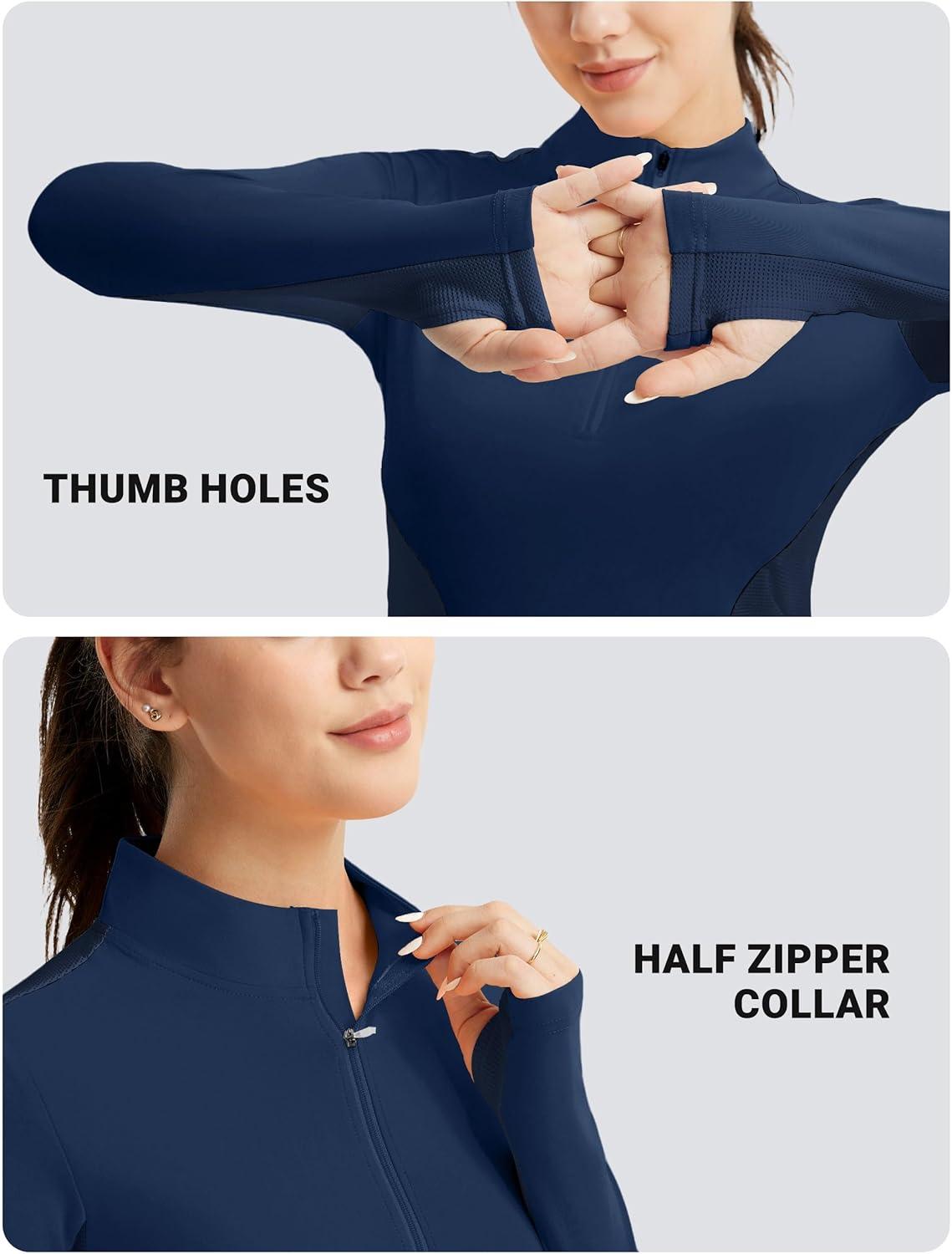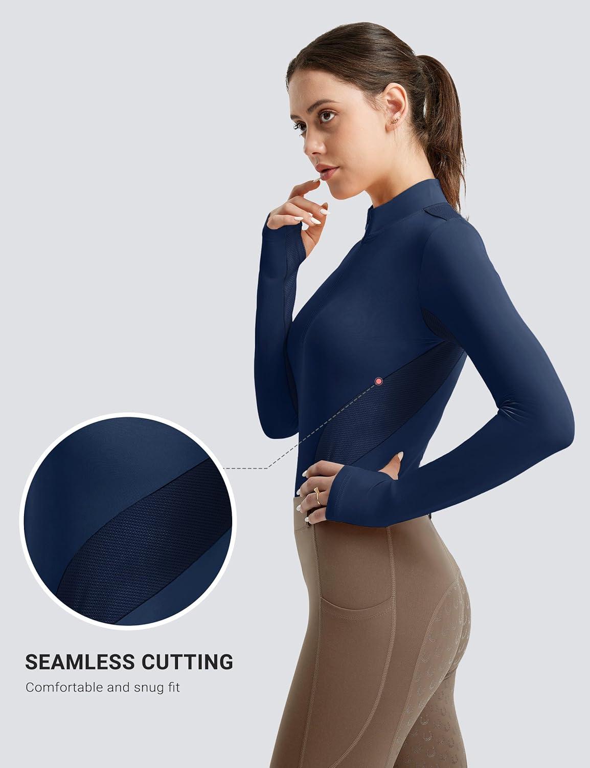 FitsT4 Sports Womens Equestrian Shirts Thumbholes Long Sleeve Horse Riding Shirts Quick Dry UPF50+ Riding Top Half Zip(Navy)