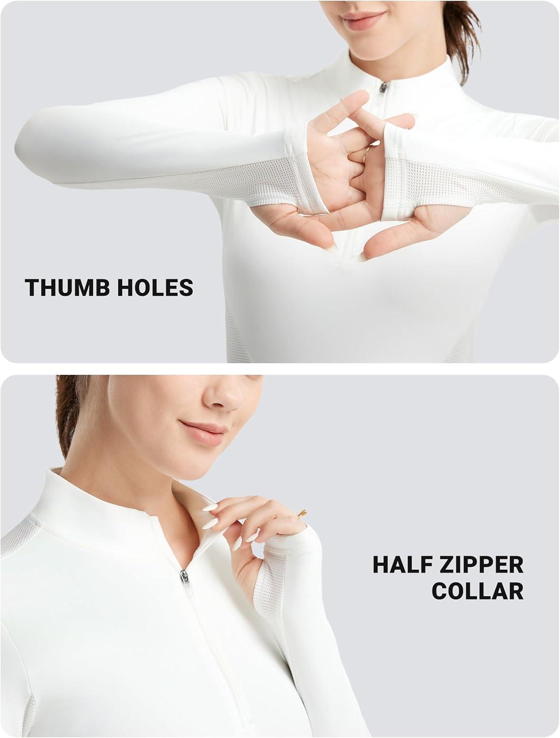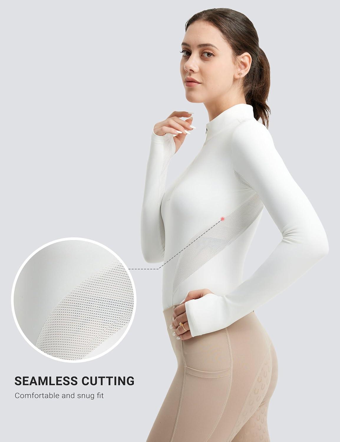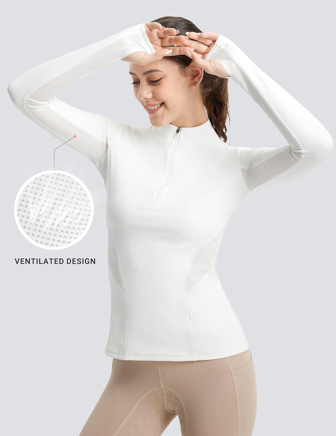 FitsT4 Sports Womens Equestrian Shirts Thumbholes Long Sleeve Horse Riding Shirts Quick Dry UPF50+ Riding Top Half Zip(White)